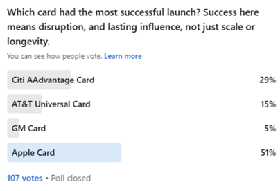 I recently revisted that question with a LinkedIn poll: Which card had the most successful launch? Success here means disruption, and lasting influence, not just scale or longevity. It’s a small but mighty sample of 100+ credit card industry enthusiasts.