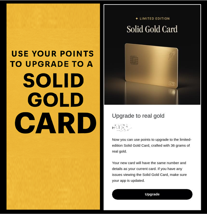 The two options include a 27-gram, 24-karat Gold Card for 100,000 points and the original 36-gram, 10-karat Solid Gold Card for 850,000 points.