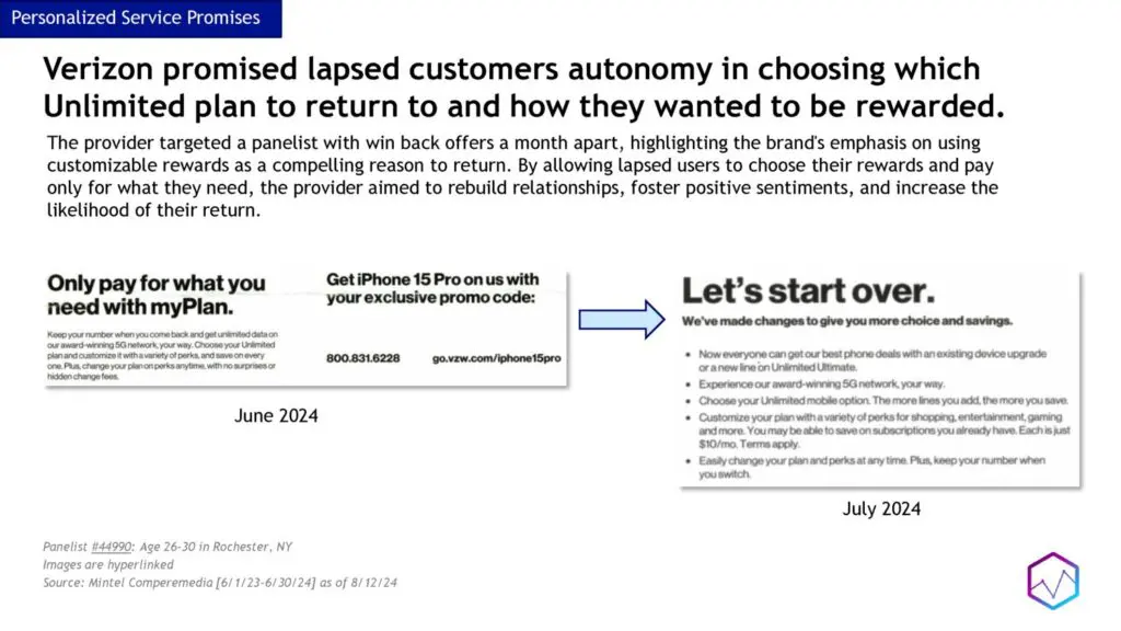 For instance, Verizon’s strategy involves giving lapsed customers autonomy in choosing which Unlimited plan to return to and how they want to be rewarded. This approach not only appeals to the customer’s sense of control but also emphasizes the value of return.